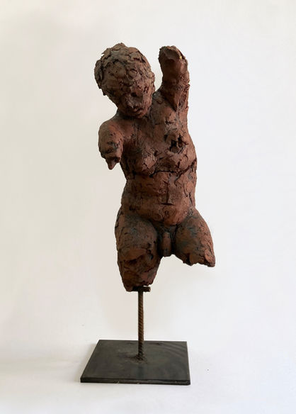 This piece was created as a “Dancing Sculpture”, meaning that I changed the figure's pose during the sculpting process so as to explore the character’s physical and emotional movement, before settling on its final form. The repeated shaping caused it to crack, leaving visible traces of its evolution.